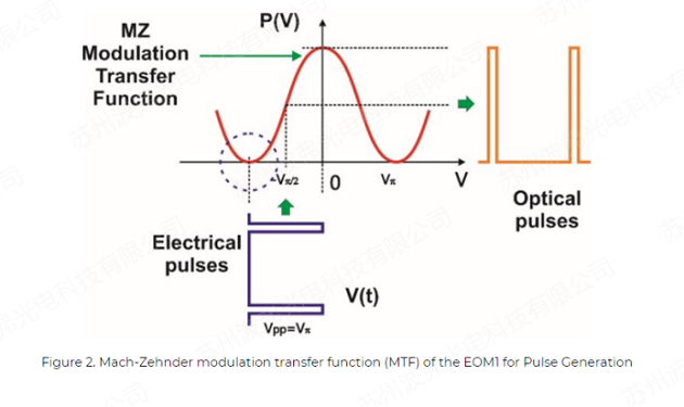 图2显示了强度电光调制器的传输函数(MTF)产生光脉冲的原理。对于脉冲宽度约为1ns的BOTDA应用,10Ghz带宽的EOM和小于100ps的上升/下降沿完全符合要求。另外EOM能够产生并维持的高消光比(ER,也可理解为信噪比)脉冲,对BOTDA系统也是至关重要的。