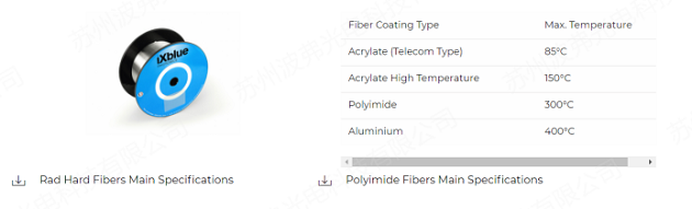 传感光纤:在一般情况下,标准SMF光纤就足够了;但温度超过85度、 光纤的标准涂覆层不能承受如此高的温度,会熔化。iXblue提供含酰化高温涂层的光纤最高可达130°C、 含聚酰亚胺涂层高达300°C,甚至铝涂层高达400°C。在空间或核辐射环境中,还需要具有抗辐照保证(Radiation Induced Attenuation-RIA)的特定光纤。