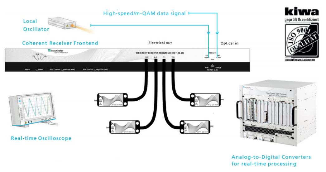 紧凑型19英寸机箱中的光学相干接收机,100 GHz带宽,包括C或L波段可选LO激光器,高速光学双偏振m-PAM和m-QAM信号的相干检测。